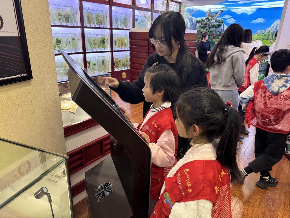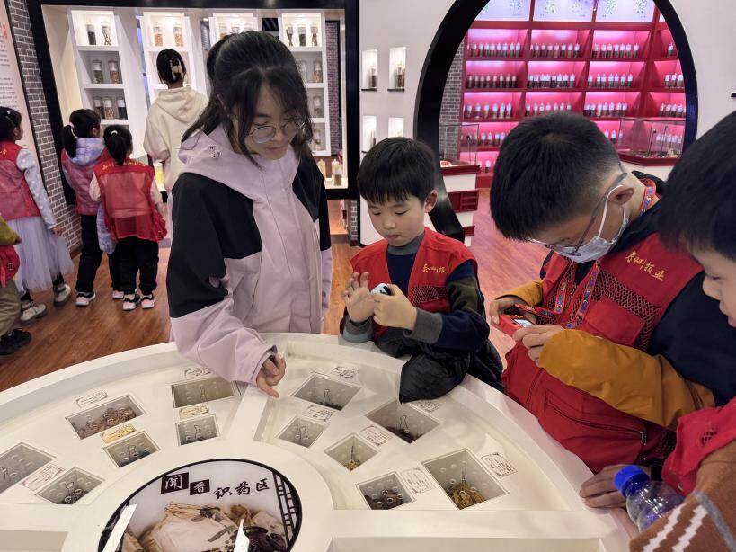 移步至中药文化馆,孩子们开启了传统医药探秘之旅。在闻香识药体验区,24种常见药材依次陈列,小记者们通过触感辨识、气味辨别等方式竞猜药名。中成药展区内,志愿者系统讲解了从传统汤剂、丸散膏丹到现代片剂、胶囊的演变历程,并以扬子江药业集团明星产品蓝芩口服液为例,解析其板蓝根、黄芩、栀子等五味药材的科学配伍原理。