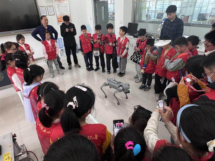 在泰州职业技术学院工业机器人技术应用基地内,仿生机器人的展示引发阵阵惊叹。当灵动机敏的机器狗和仿人形机器人亮相时,孩子们立即围拢上来:“能跳支舞吗?”“可以翻个跟头吗?”“我们握个手吧!”此起彼伏的互动声中,机器人精准完成各类高难度动作,将科技的魅力展现得淋漓尽致。