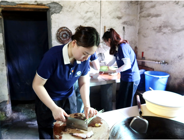 翻山越岭,学子们来到茅坪镇马源村老乡家中自制红军餐。在当地老乡热情指导下,大家生火做饭,食材调料皆由老乡倾囊相赠。灶火噼啪,锅铲翻飞,饭菜飘香。餐后,学子们主动打扫清洗。洗碗时,卫生经济管理学院2024级学生夏语晗动情道:“老乡的无私让我们触摸到跨越九十年的‘军民鱼水情’。这不仅是做饭,更是生动的群众路线实践课。作为未来服务基层的中医药人,我们要在服务人民中践行初心。”