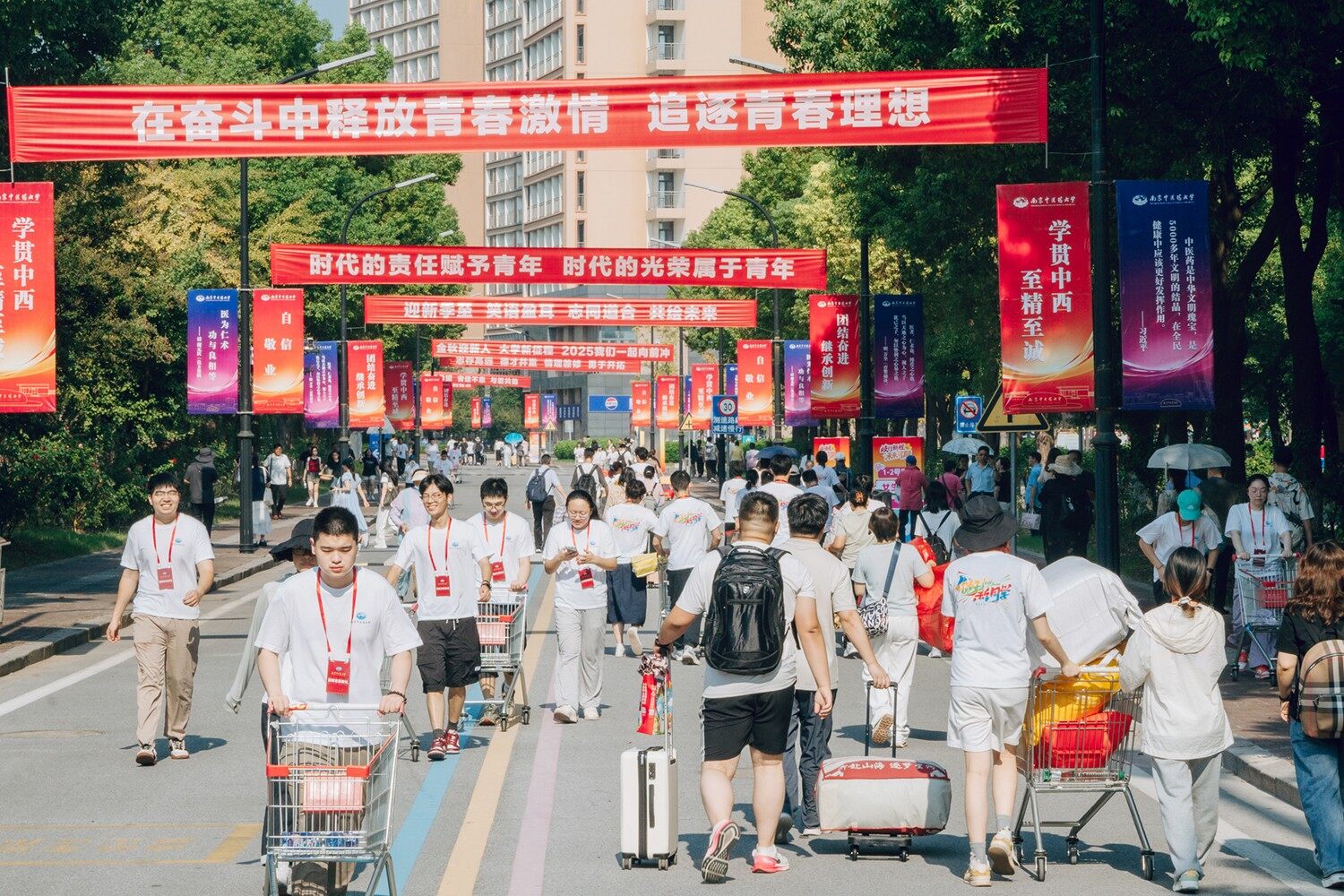 当新生与家长踏入校园,一声声“同学,报到点请左转,我来帮您拿行李!”“宿舍在三楼,这边电梯更便捷!”不绝于耳。学长学姐们热情指引,迅速消除了新生们一路的奔波疲惫。校园主干道彩旗飘扬,“欢迎‘小杏仁’回家”的横幅格外醒目,各学院报到点可谓创意满满,有的发放印有《本草纲目》插画的文创礼包,有的赠送迷你艾草香囊,中医药元素无处不在。“一站式”报到台前,流程高效便捷,短短几分钟,新生们便完成了从“萌新”到“南中医学子”的身份转变。校领导也亲临迎新现场,慰问工作人员,为“高效又温暖”的迎新举措点赞。