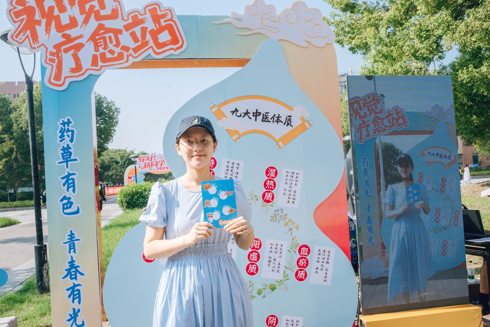 迎新现场,最热闹的当属“新五感告白计划”中医药文化市集。刚完成报到的新生纷纷驻足,通过视觉、听觉、嗅觉、触觉和味觉,多维度感受中医药文化的魅力。